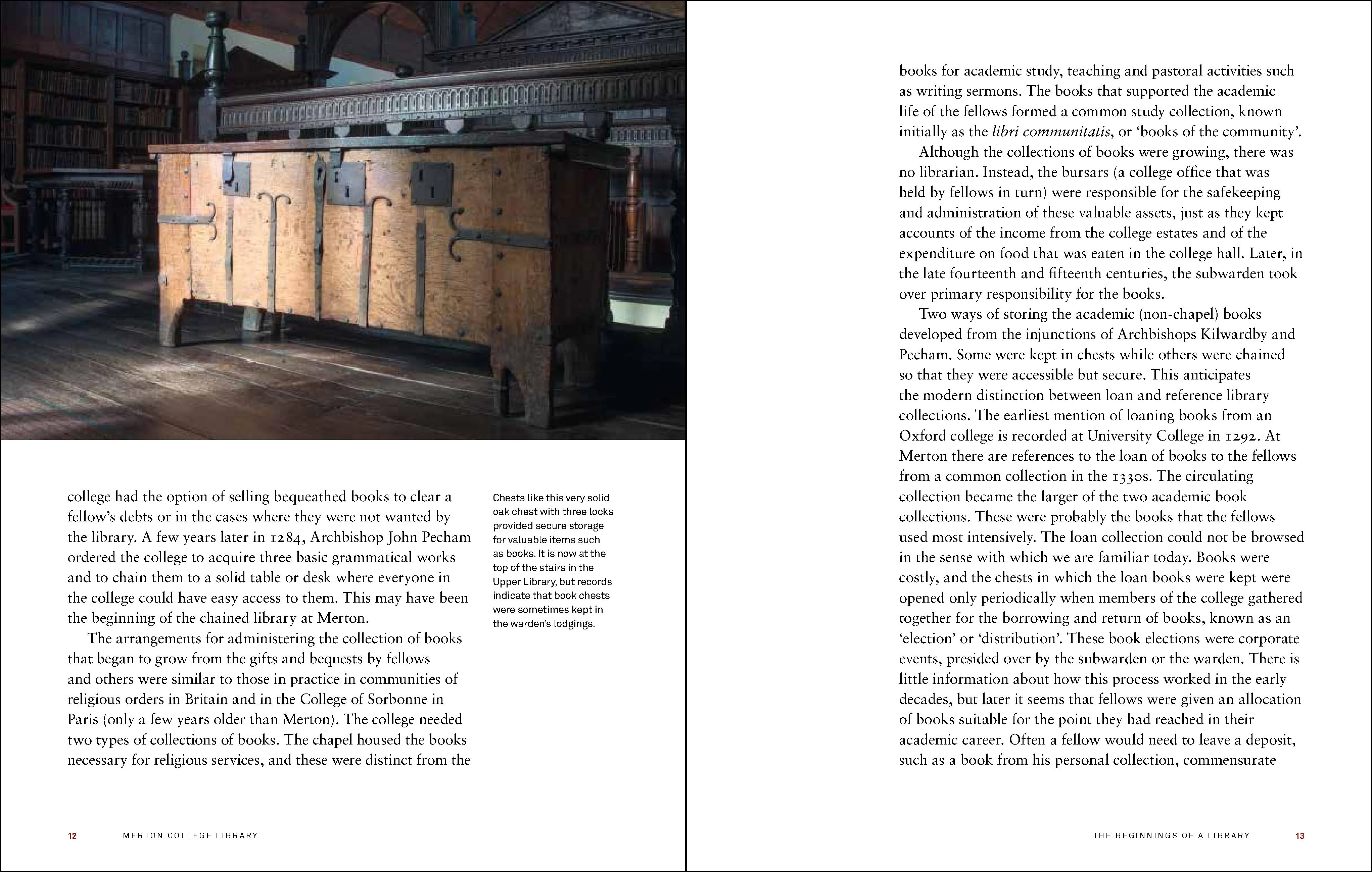 The Merton library is rightly known for its antiquity, its beautiful medieval and early modern architecture and fittings and for its remarkable and important collection of manuscripts and rare books, yet a nineteenth-century plan to tear the medieval library down and replace it was only narrowly frustrated. This brief history of Europe’s oldest academic library traces its origins in the thirteenth century, when a new type of community of scholars was first being set up, through to the present day and its multiple functions as a working college library, a unique resource for researchers and a delight for curious visitors.